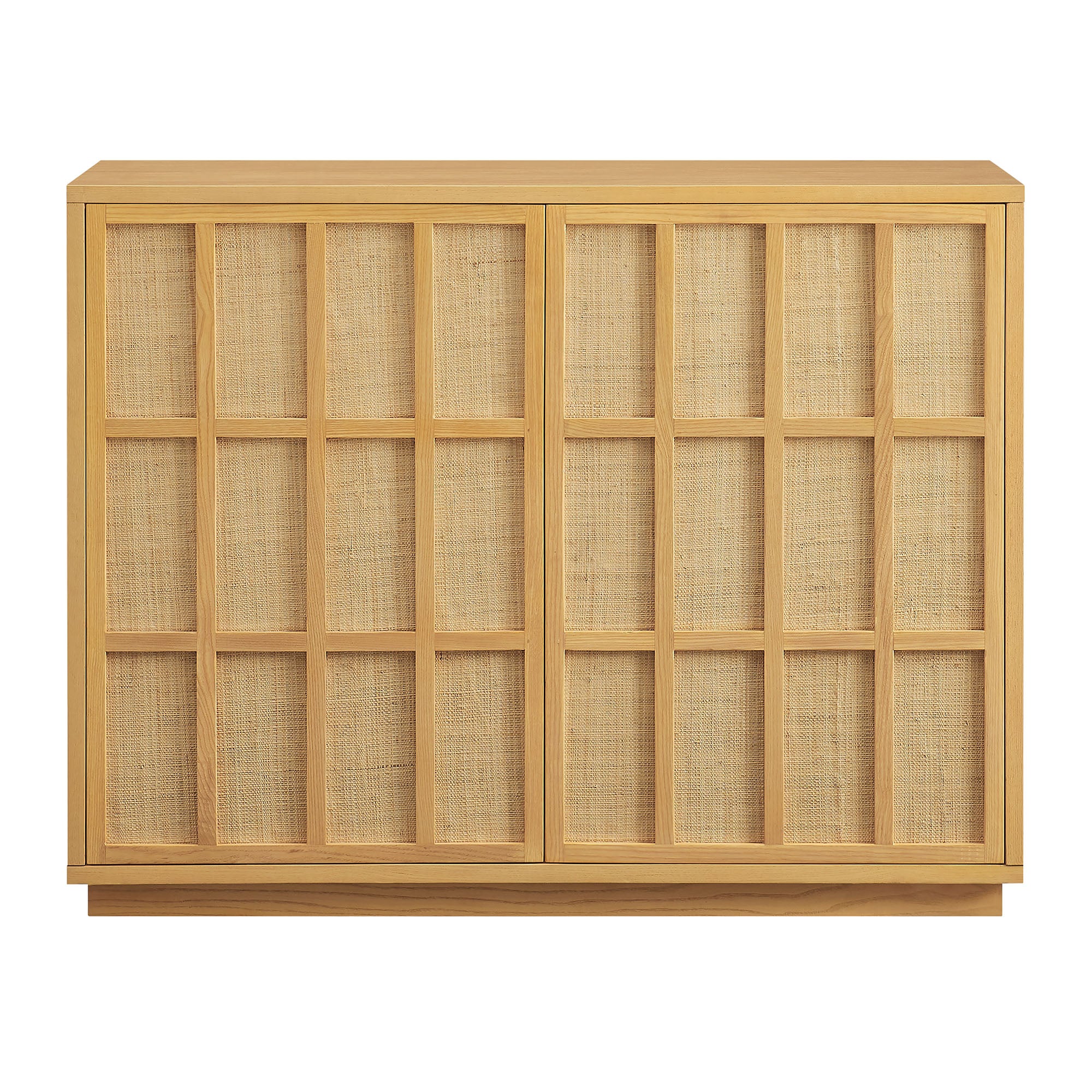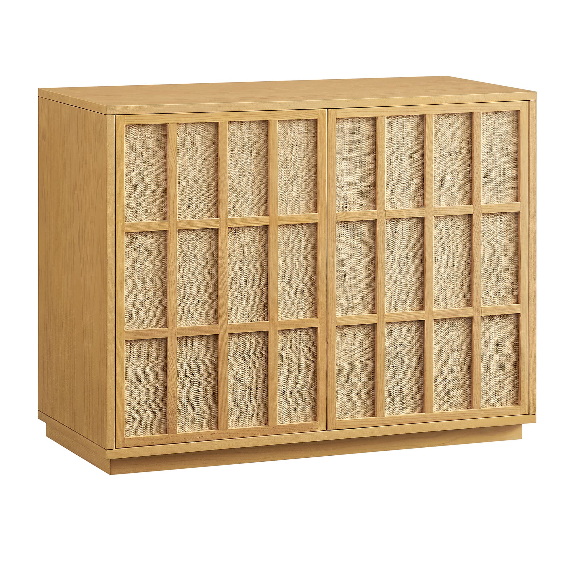 The Aiko 39 Inch Japandi Accent Cabinet is an easy, stylish way to add extra storage without taking up too much space. Crafted with a wood frame and ash wood veneer, this two-door cabinet features woven panel door fronts in a geometric grid pattern with push-to-open doors for a smooth, hardware-free look. With one adjustable shelf and one fixed shelf, it offers easy storage for serveware, glassware, books, or bar essentials. Style it as a hallway cabinet, liquor cabinet, or a living room accent hutch for a calm, pulled-together look. Its minimalist Japanese style brings a calm, clean look to dining rooms, hallways, or living spaces while adding everyday storage. Well suited to coastal and relaxed modern interiors, Aiko includes non-marking floor glides to help protect floors. Assembly required. Weight Capacity: Top : 132lb, Top Shelf : 57lb, Bottom Shelf : 57lb
