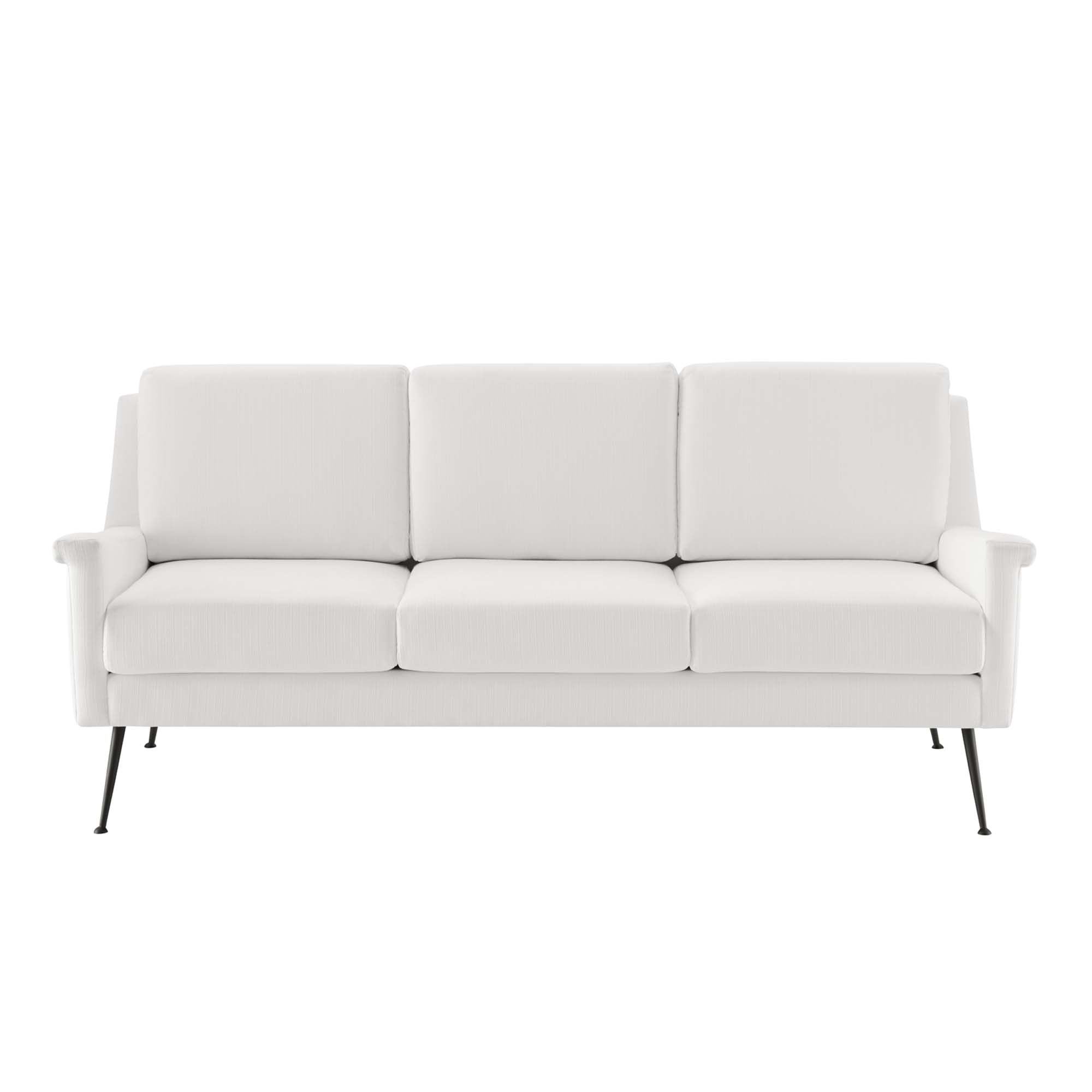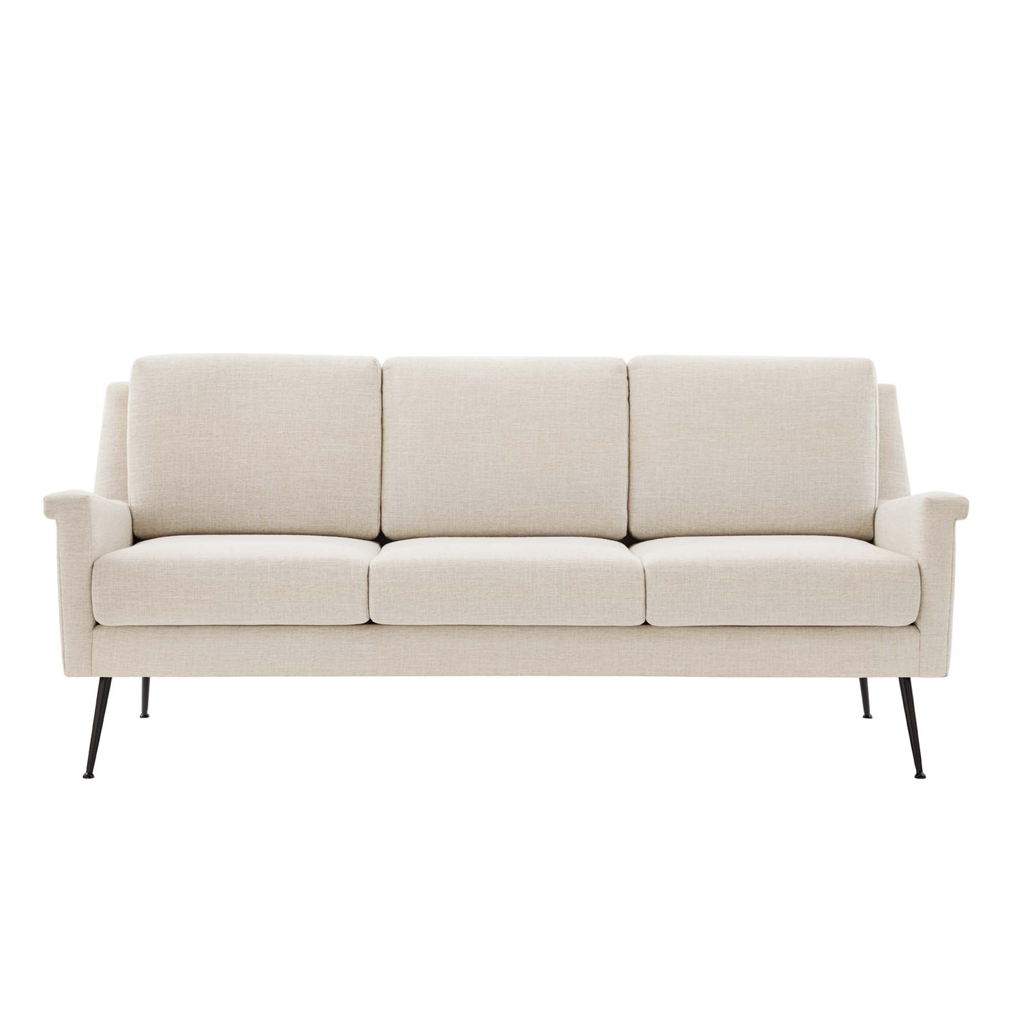Redefine your living space with the modern design and retro style of the Chesapeake Fabric Sofa. Featuring a tailored profile and subtle flared silhouette, this fabric sofa refreshes a living room, den, office, or bedroom sitting area. Offering a luxurious seating experience, this sofa is upholstered in durable polyester fabric and padded with dense foam for ultimate comfort. Resting atop matte black metal legs, this living room sofa is crafted with solid wood and plywood and supports up to 600 lbs.