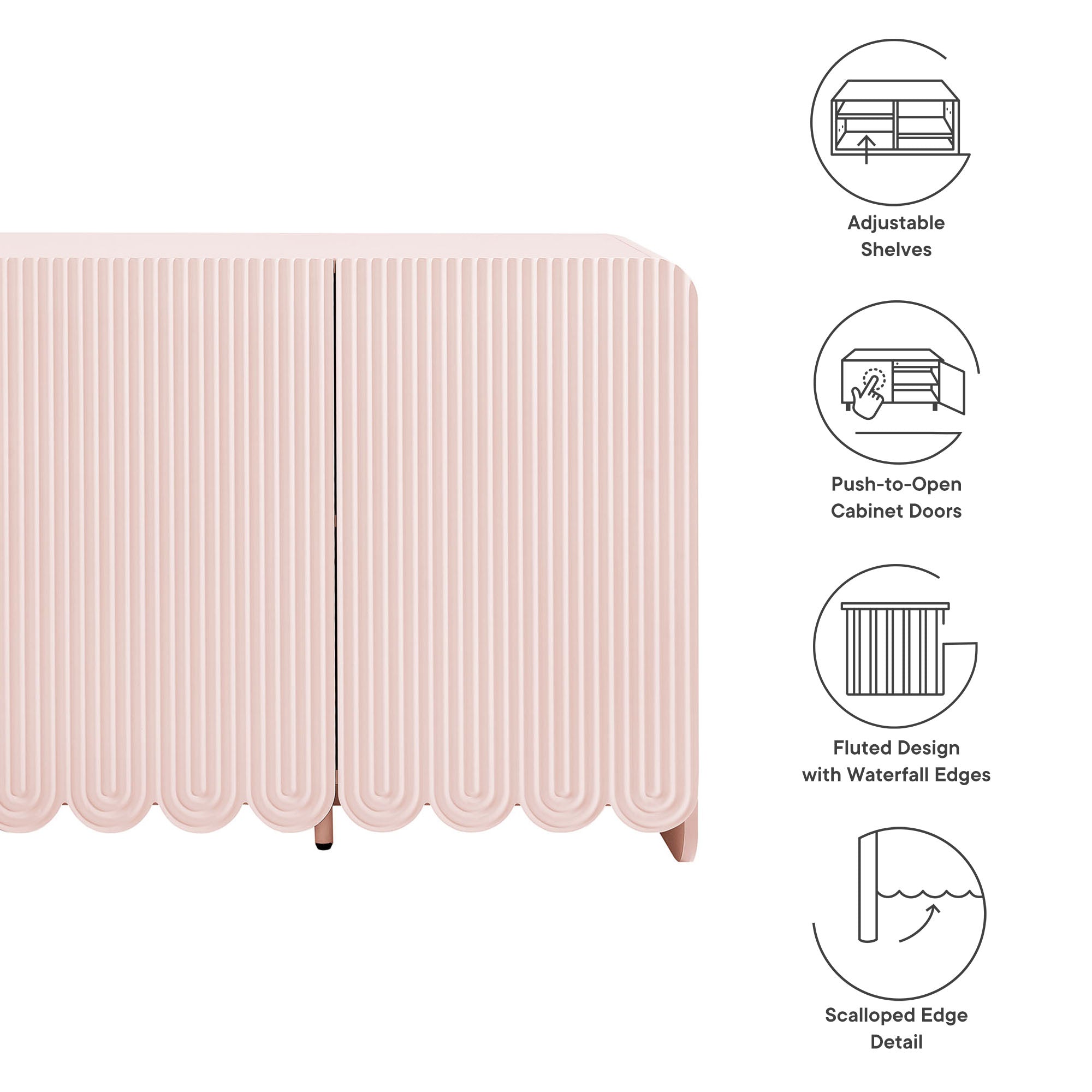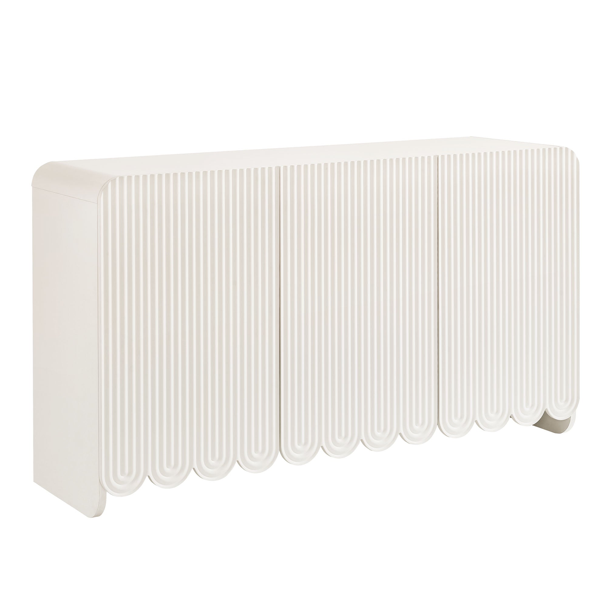 Add a touch of feminine charm and grace to your space with the Dahlia Fluted Sideboard Cabinet. A whimsical blend of functionality and artistry, this elegant storage cabinet boasts a captivating fluted front and scalloped bottom detail, evoking the playful curves of a blooming flower. With three push-to-open doors and soft-close hinges, the Dahlia Credenza offers a seamless blend of modern convenience and timeless design. Inside, adjustable shelves await to neatly house dining essentials, books, or cherished treasures, while the rounded waterfall edge frame adds a soft sophistication. Designed with center support legs and non-marking floor glides, this console cabinet ensures both stability and floor protection. Whether in your dining room, entryway, or living room, the Dahlia 3-Door Sideboard is more than storage—it's a statement piece full of charm and delight. Assembly required.