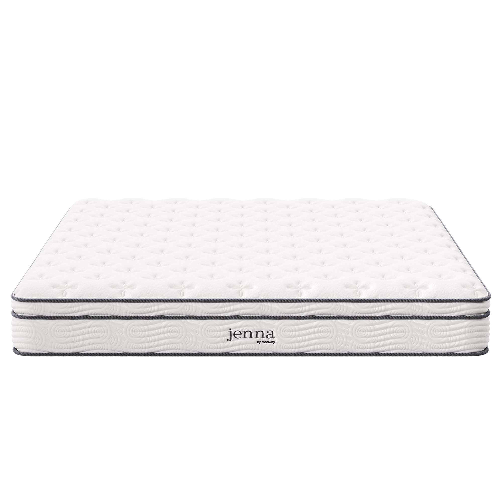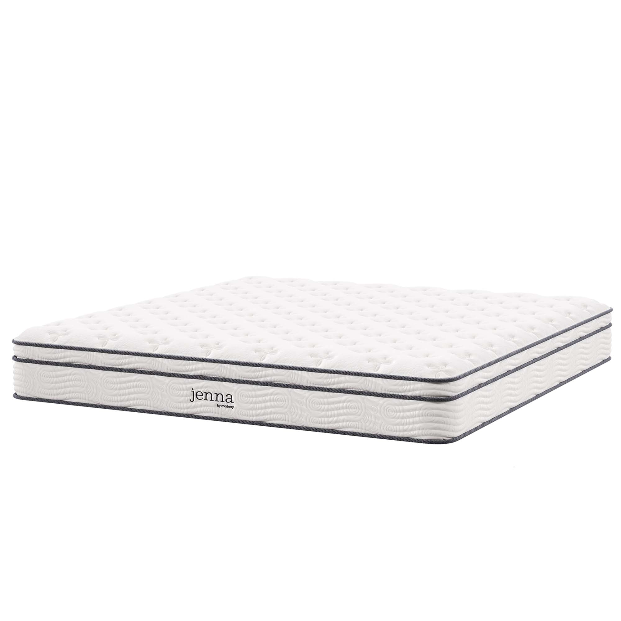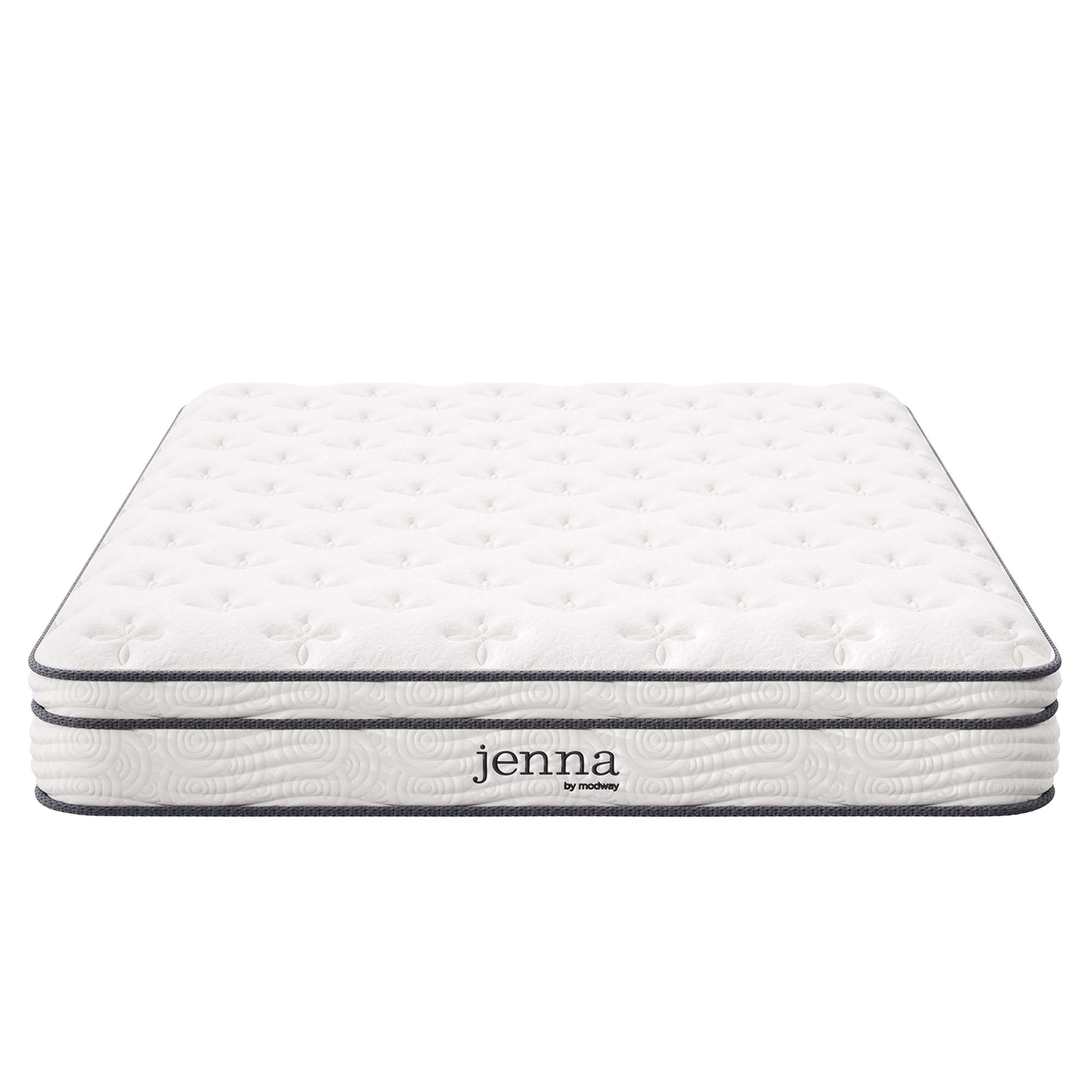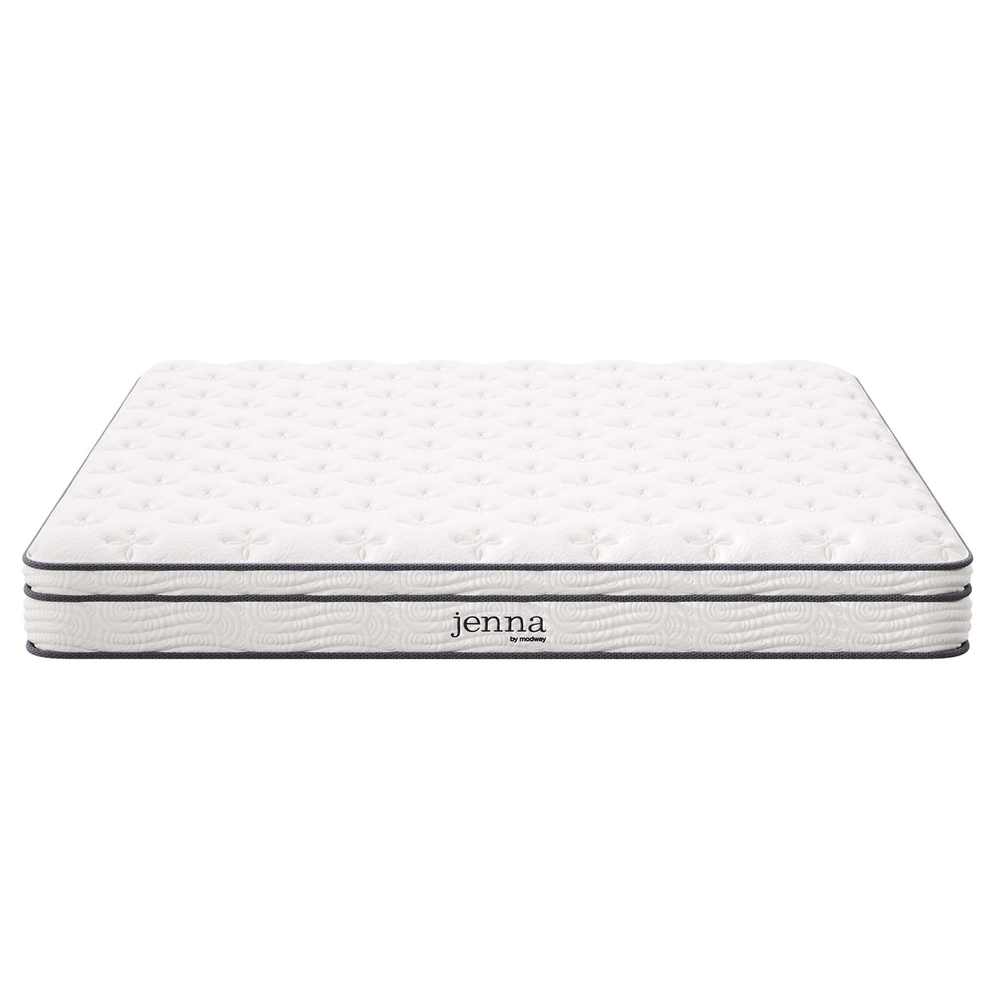 Enjoy rejuvenating sleep with the Jenna 8” Innerspring Mattress. Jenna features individually wrapped pocket coils that isolate motion between sleeping partners and provide pressure relief and spinal alignment. Responsive to the needs of the side, back, and stomach sleeping styles, Jenna’s 7” tall coils come padded underneath a layer of responsive foam and breathable foam for maximum comfort. Complete with a quilted pillow-top cover, this hybrid mattress relieves pressure on hips, back, and shoulders, while delivering cooling airflow night after night. Jenna is a firm innerspring mattress that avoids the sag and sink of foam and air mattresses, and ships compressed and rolled into a box for easy delivery.