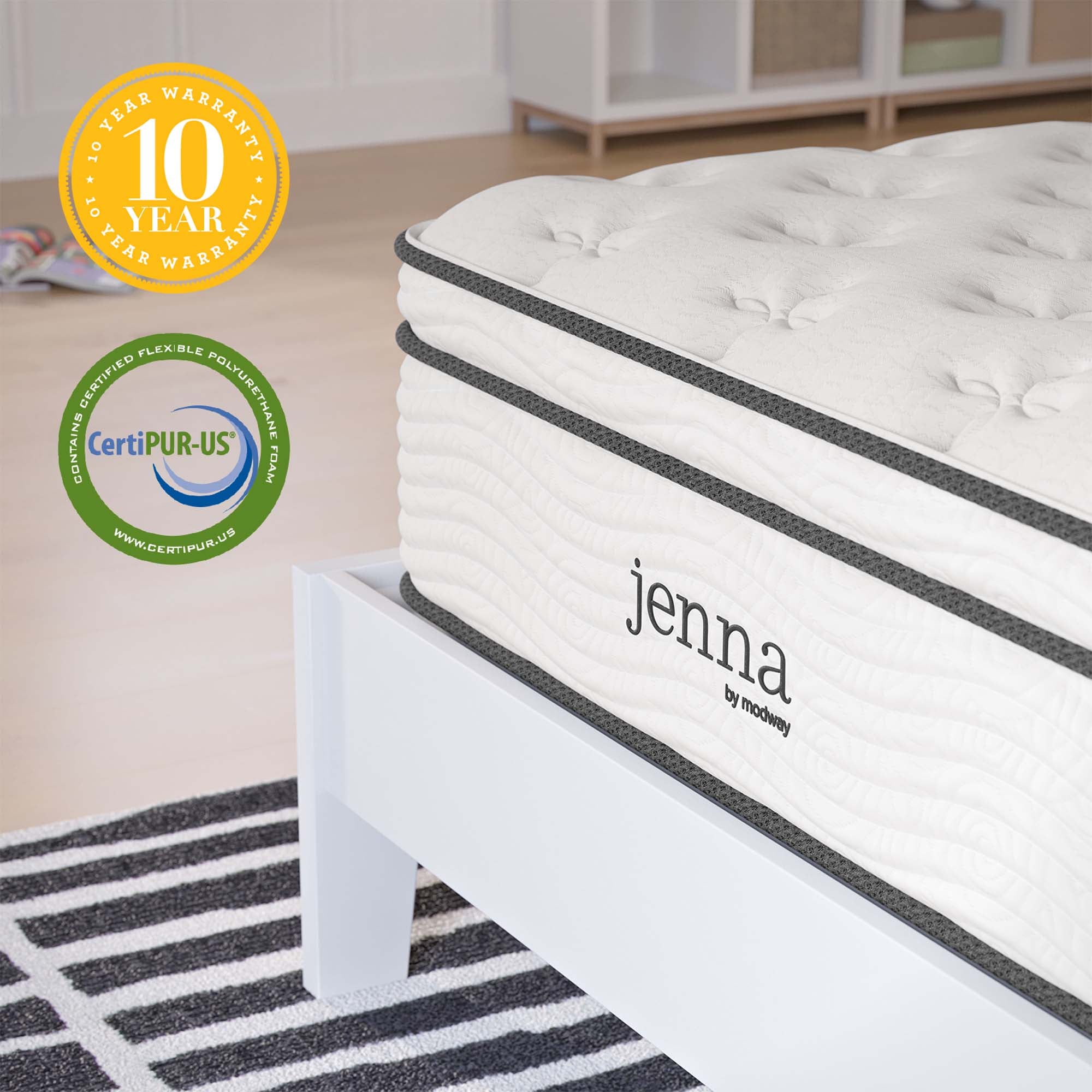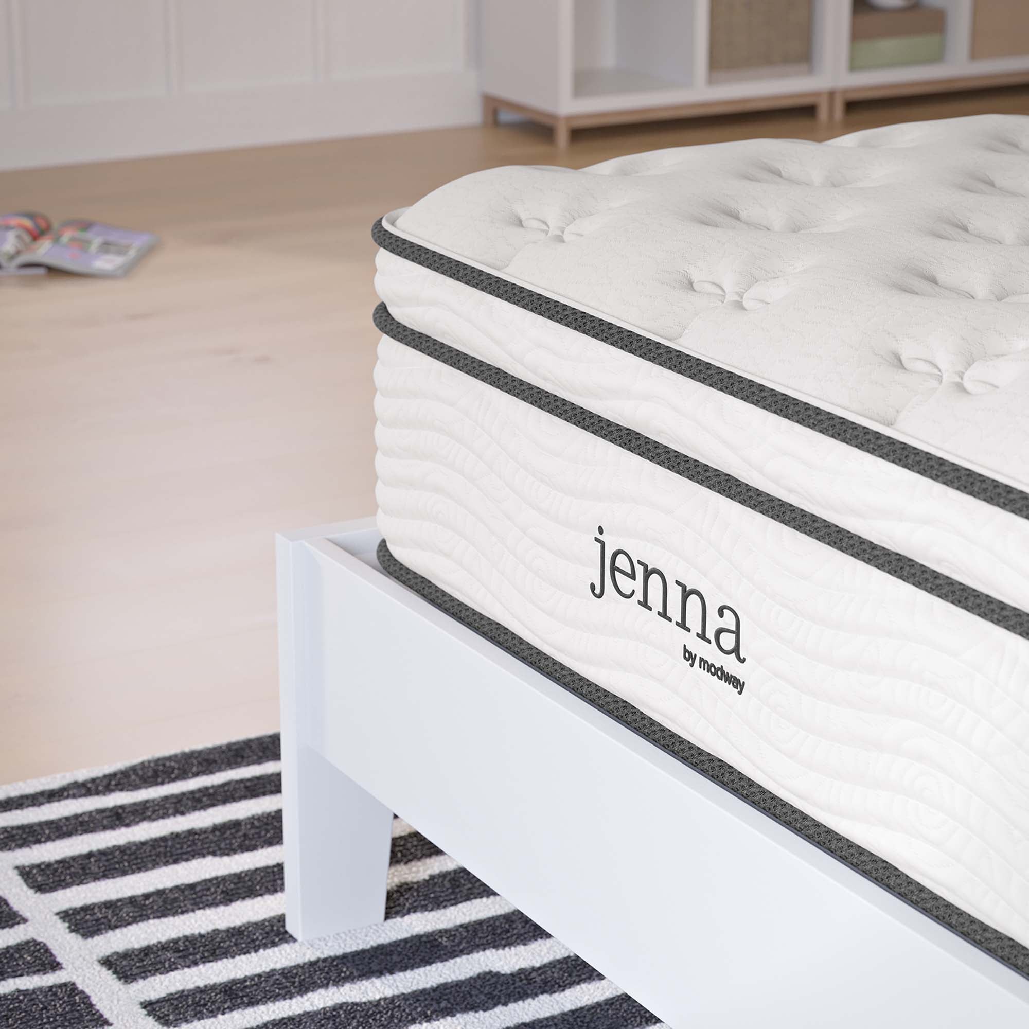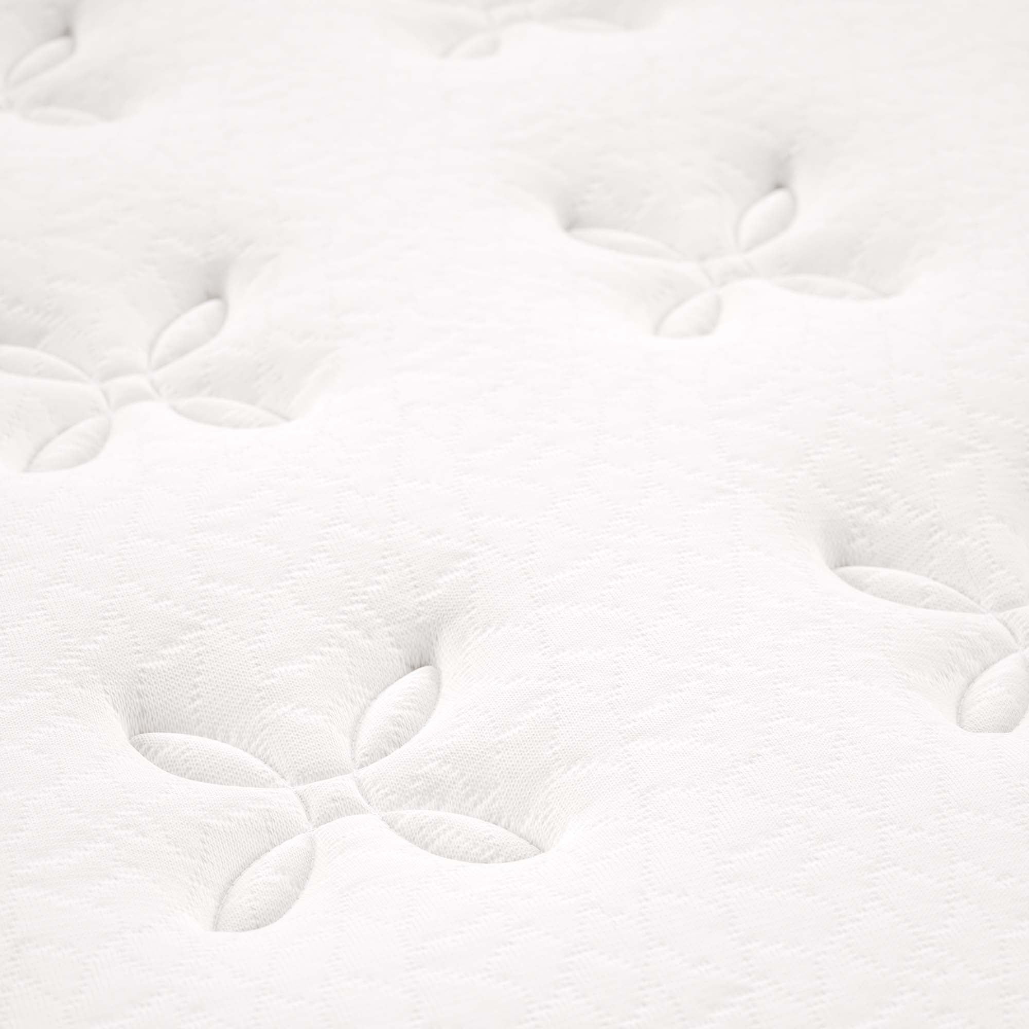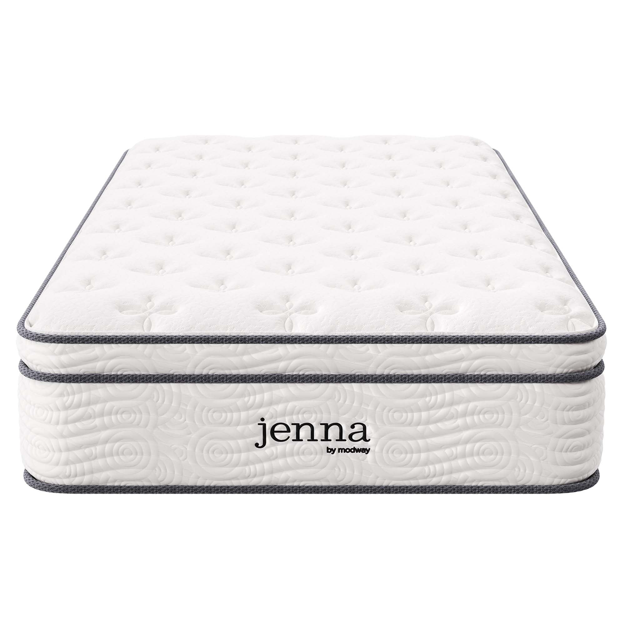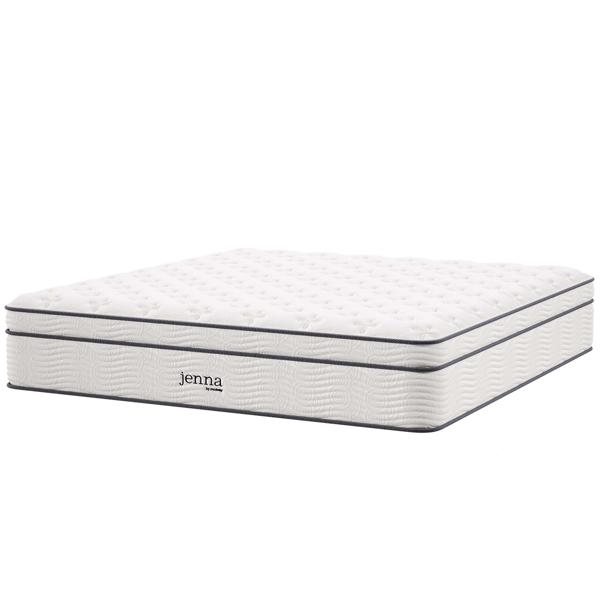 Enjoy rejuvenating sleep with the Jenna 8” Innerspring Mattress. Jenna features individually wrapped pocket coils that isolate motion between sleeping partners and provide pressure relief and spinal alignment. Responsive to the needs of the side, back, and stomach sleeping styles, Jenna’s 7” tall coils come padded underneath a layer of responsive foam and breathable foam for maximum comfort. Complete with a quilted pillow-top cover, this hybrid mattress relieves pressure on hips, back, and shoulders, while delivering cooling airflow night after night. Jenna is a firm innerspring mattress that avoids the sag and sink of foam and air mattresses, and ships compressed and rolled into a box for easy delivery.