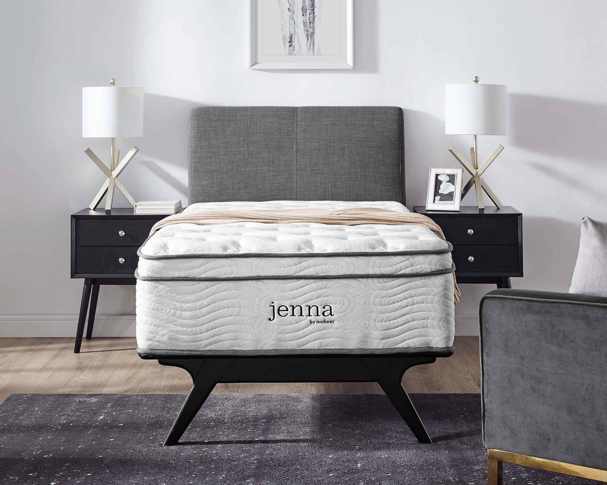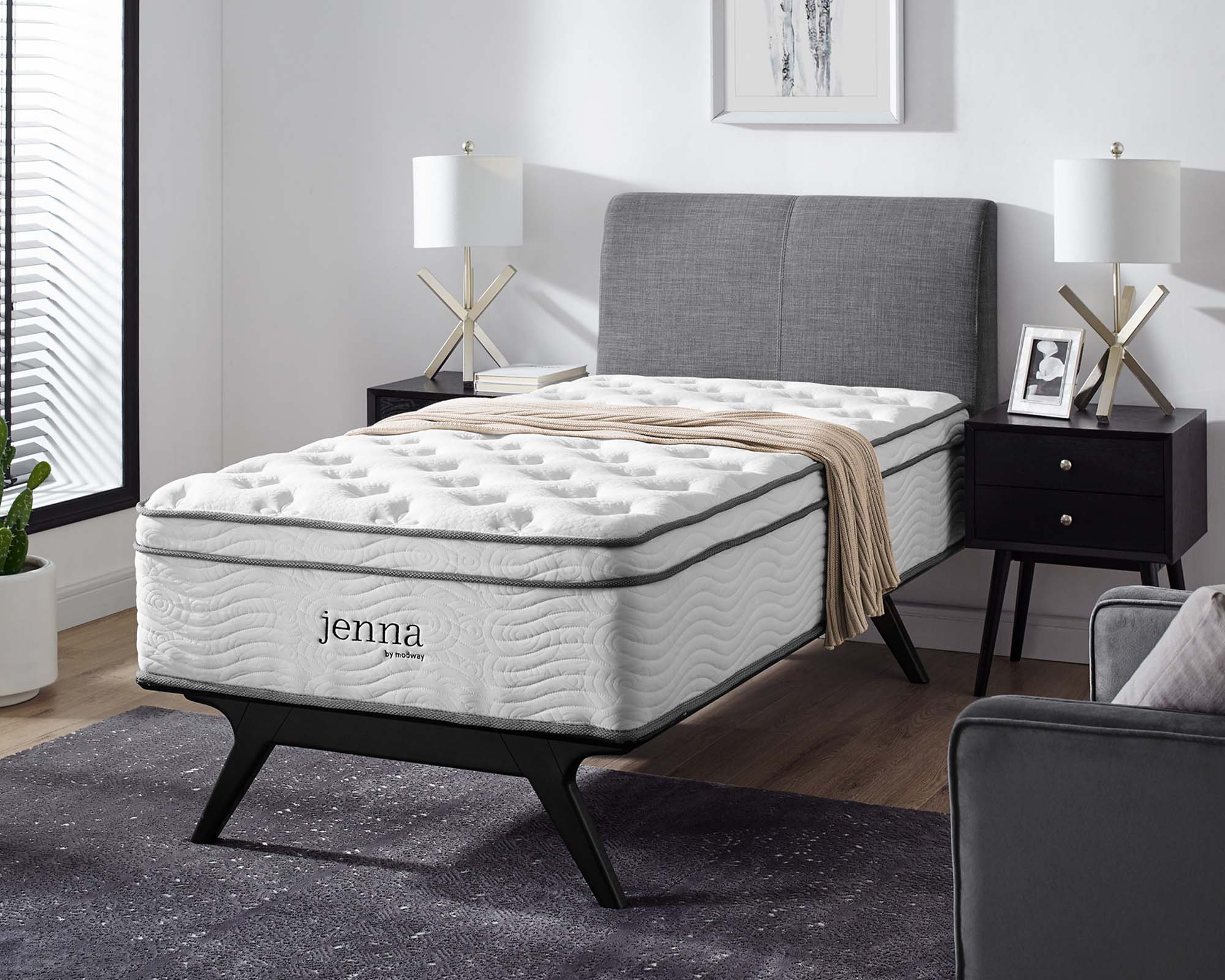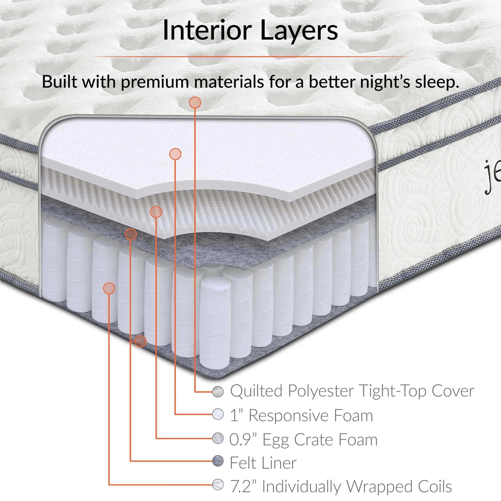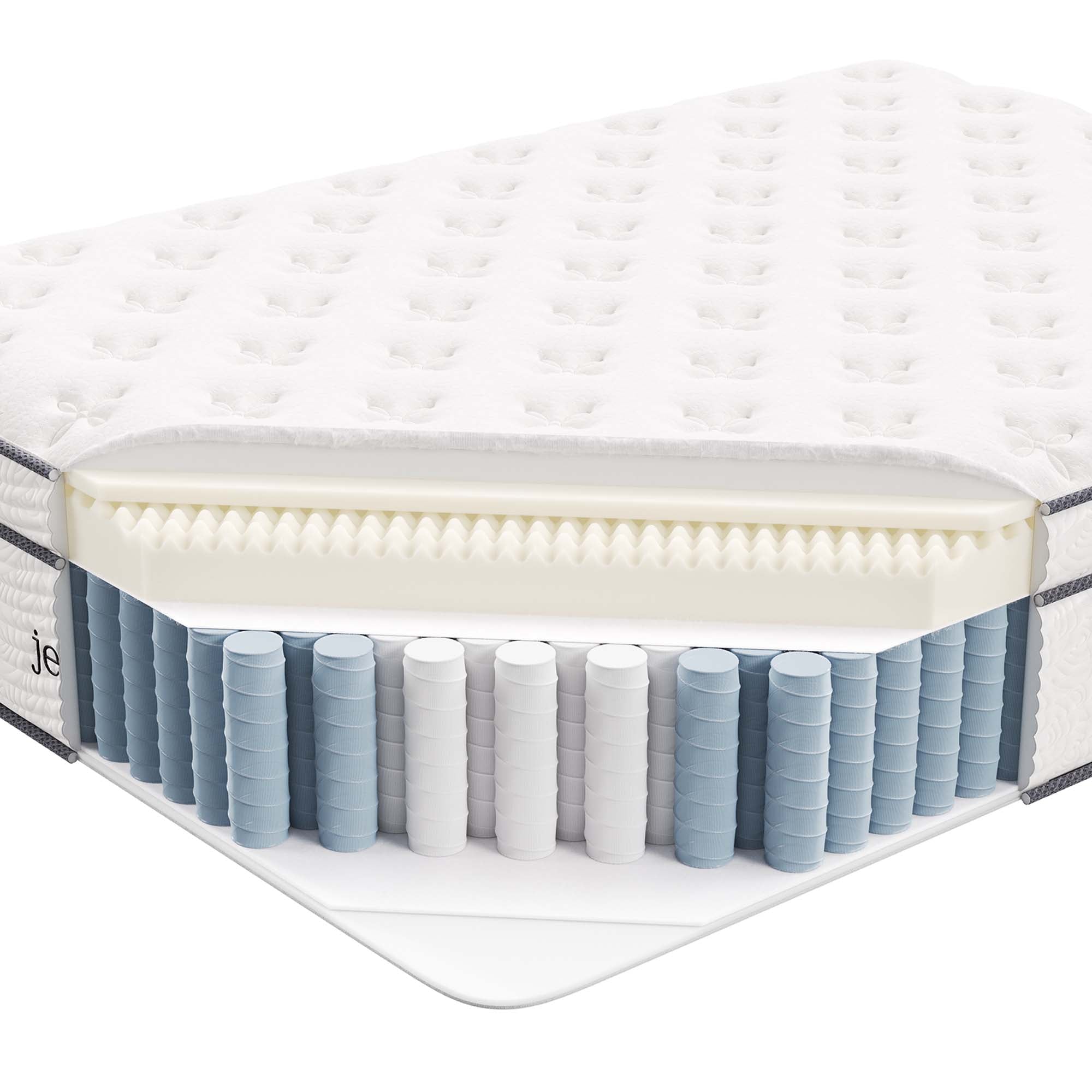 Enjoy rejuvenating sleep with the Jenna 8” Innerspring Mattress. Jenna features individually wrapped pocket coils that isolate motion between sleeping partners and provide pressure relief and spinal alignment. Responsive to the needs of the side, back, and stomach sleeping styles, Jenna’s 7” tall coils come padded underneath a layer of responsive foam and breathable foam for maximum comfort. Complete with a quilted pillow-top cover, this hybrid mattress relieves pressure on hips, back, and shoulders, while delivering cooling airflow night after night. Jenna is a firm innerspring mattress that avoids the sag and sink of foam and air mattresses, and ships compressed and rolled into a box for easy delivery.