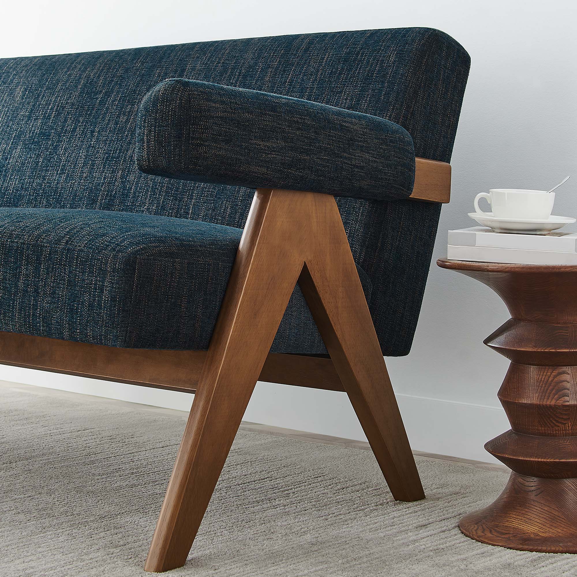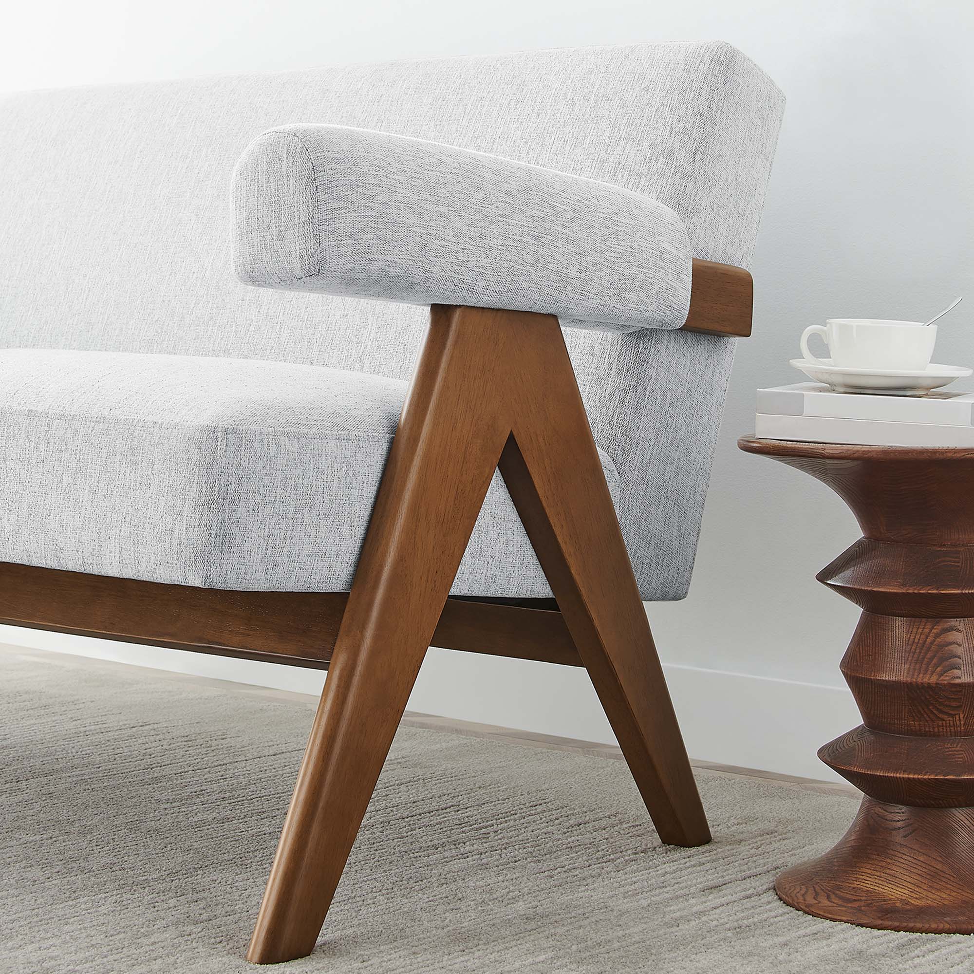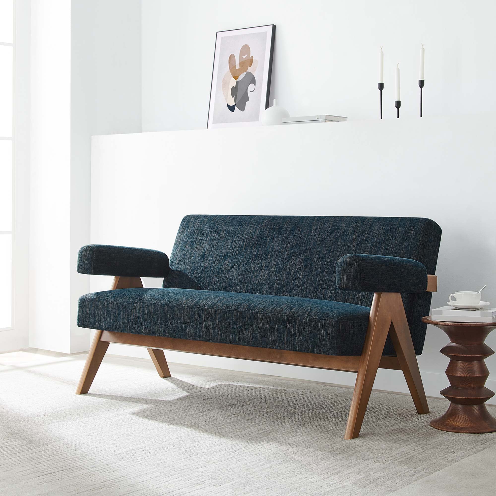 Add comfort and style to your home with the Lyra Heathered Fabric Upholstered Loveseat. This contemporary settee is chic and luxurious, featuring a relaxed design with a subtly angled backrest. Lyra comes upholstered in woven heathered fabric, creating a comfortable resting spot where you can dive into a good book or enjoy a cup of coffee. Featuring a sturdy plywood frame, inverted V-shaped rubberwood legs, and dense foam padding, this modern loveseat provides stability while enhancing living room, bedroom, hallway, or entryway spaces. Includes non-marking feet. Assembly Required. Weight Capacity: 662 lbs.