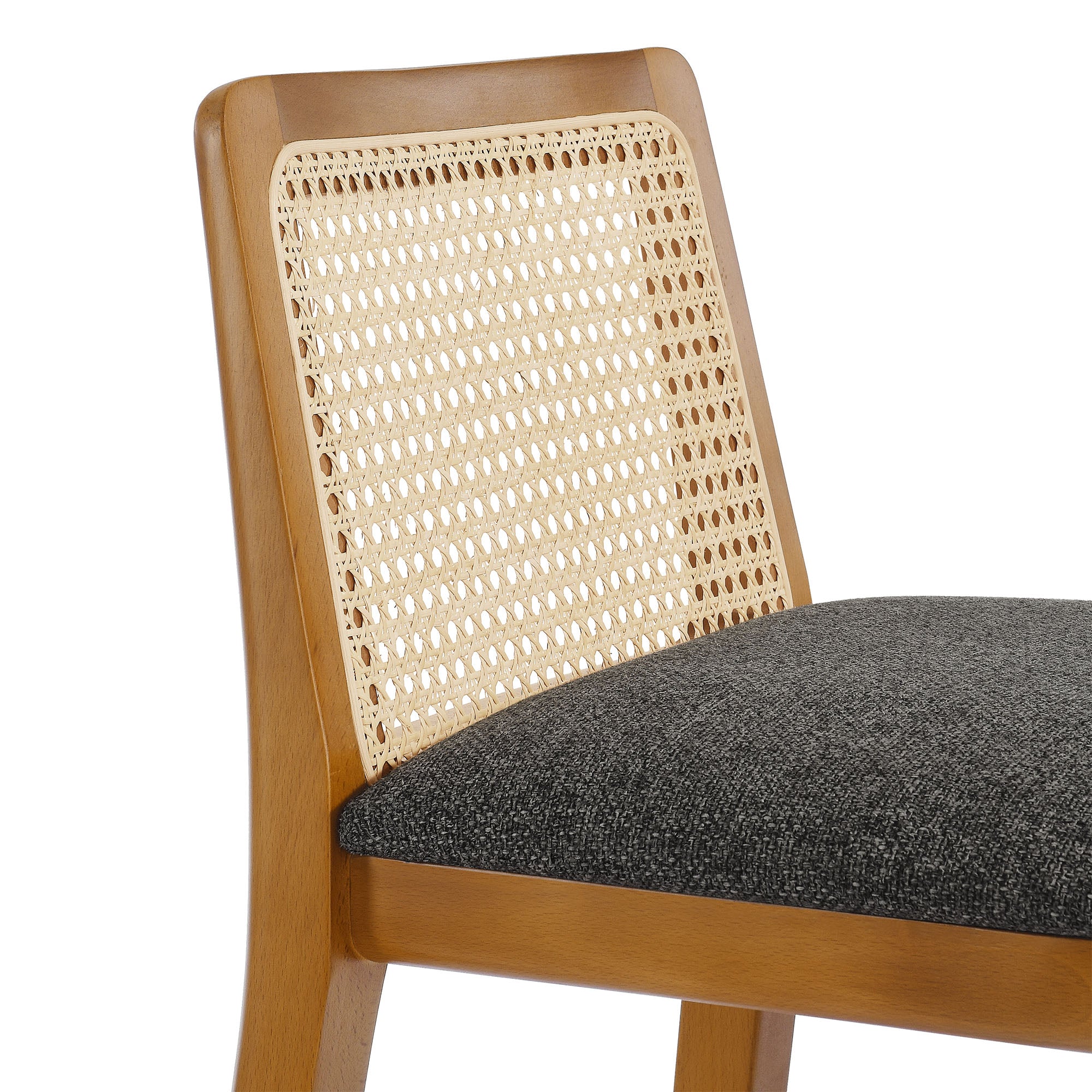 Elevate your kitchen or home bar with the Monarch Bar Stool, a stunning blend of French country elegance and modern farmhouse style. This wooden barstool features a sturdy beech wood frame and a rattan backrest with intricate cane webbing, granting both style and durability. The dense foam padded seat, covered in soft fabric upholstery, provides lasting comfort, making it a comfortable padded bar stool perfect for longer gatherings. Designed as a modern bar-height stool, Monarch offers versatile placement around a bartop or bar-height table. Whether used as a single cane back bar stool or as a farmhouse accent stool, it enhances your dining experience with its refined aesthetic and protects floors with its non-marking floor glides. This cane bar stool fits seamlessly into any décor, making it perfect for both formal gatherings and casual meals. The Monarch Bar Stool combines traditional craftsmanship with contemporary style, making it a versatile wood rattan barstool with natural cane mesh for your home bar or kitchen. Weight Capacity: 330 lbs.