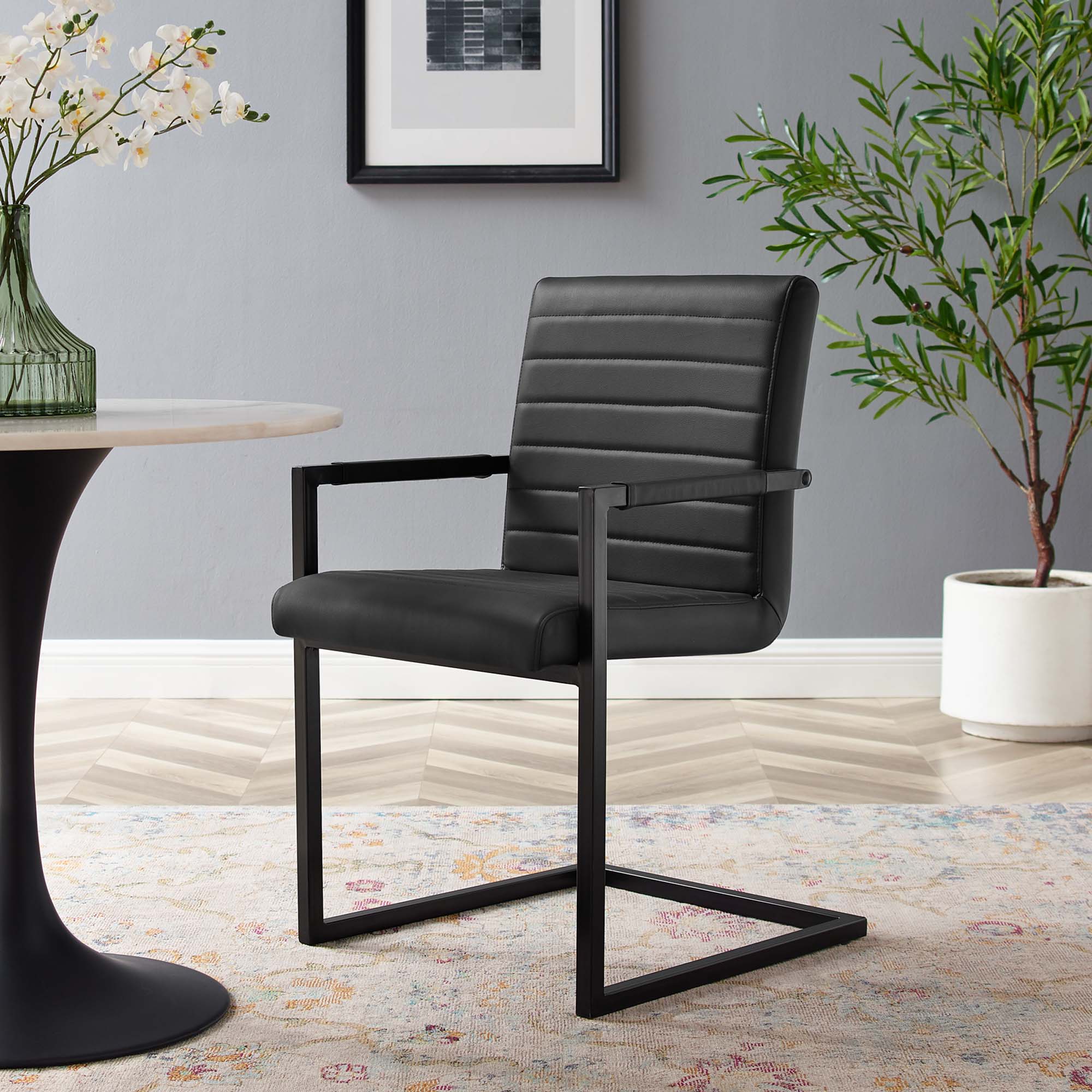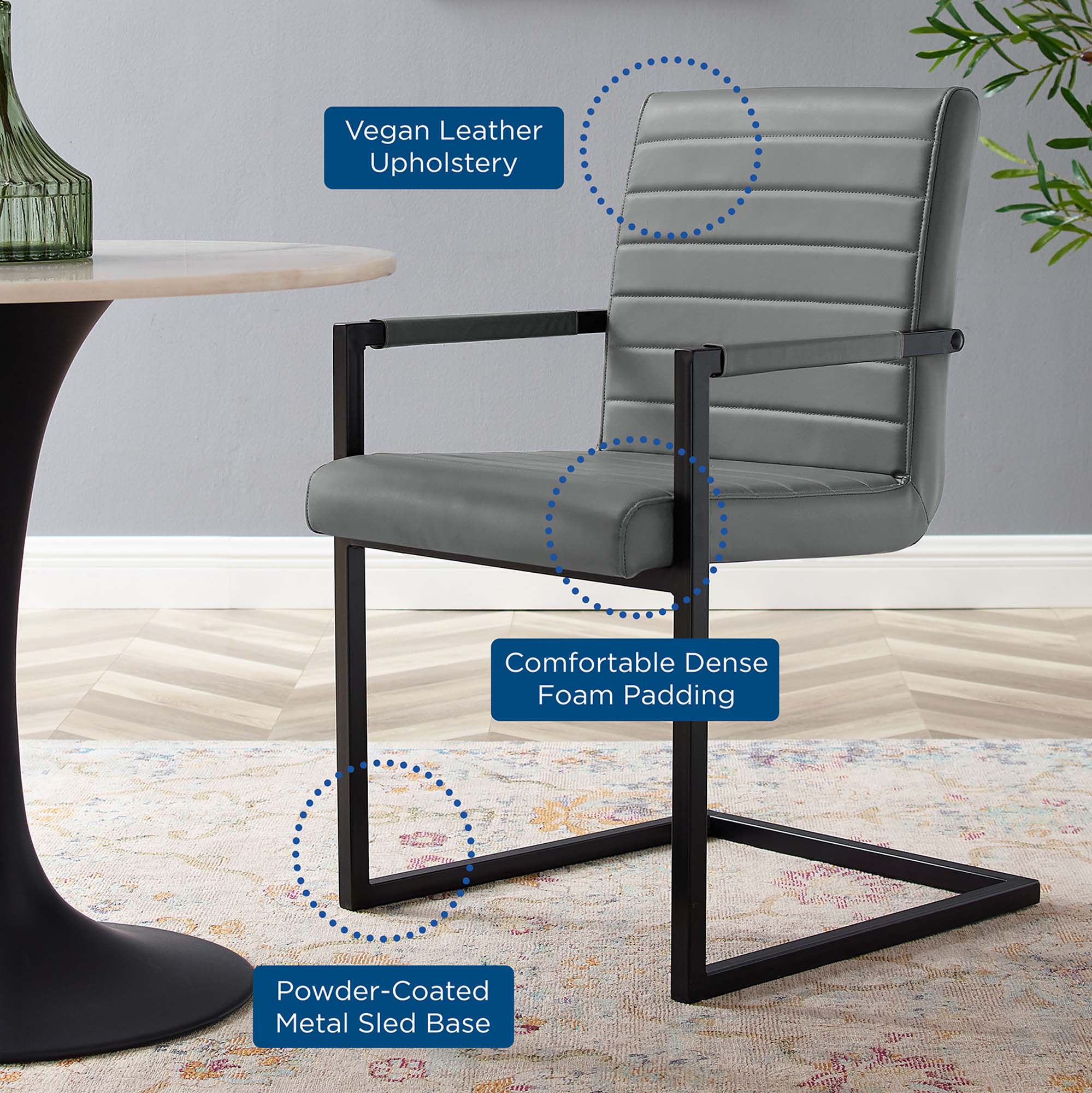 Bring contemporary intrigue and retro modern style to your dining space with the Savoy Vegan Leather Dining Chairs - Set of 2. Vegan leather upholstery makes this armchair perfect for the dining room or living space, while horizontal channel tufting brings mid-century detail. This accent chair features a sled base crafted with square tubular powder-coated metal, non-marking foot caps, and padded armrests. Dense foam padding offers a supportive seat while dining or relaxing. Chair Weight Capacity: 300 lbs.