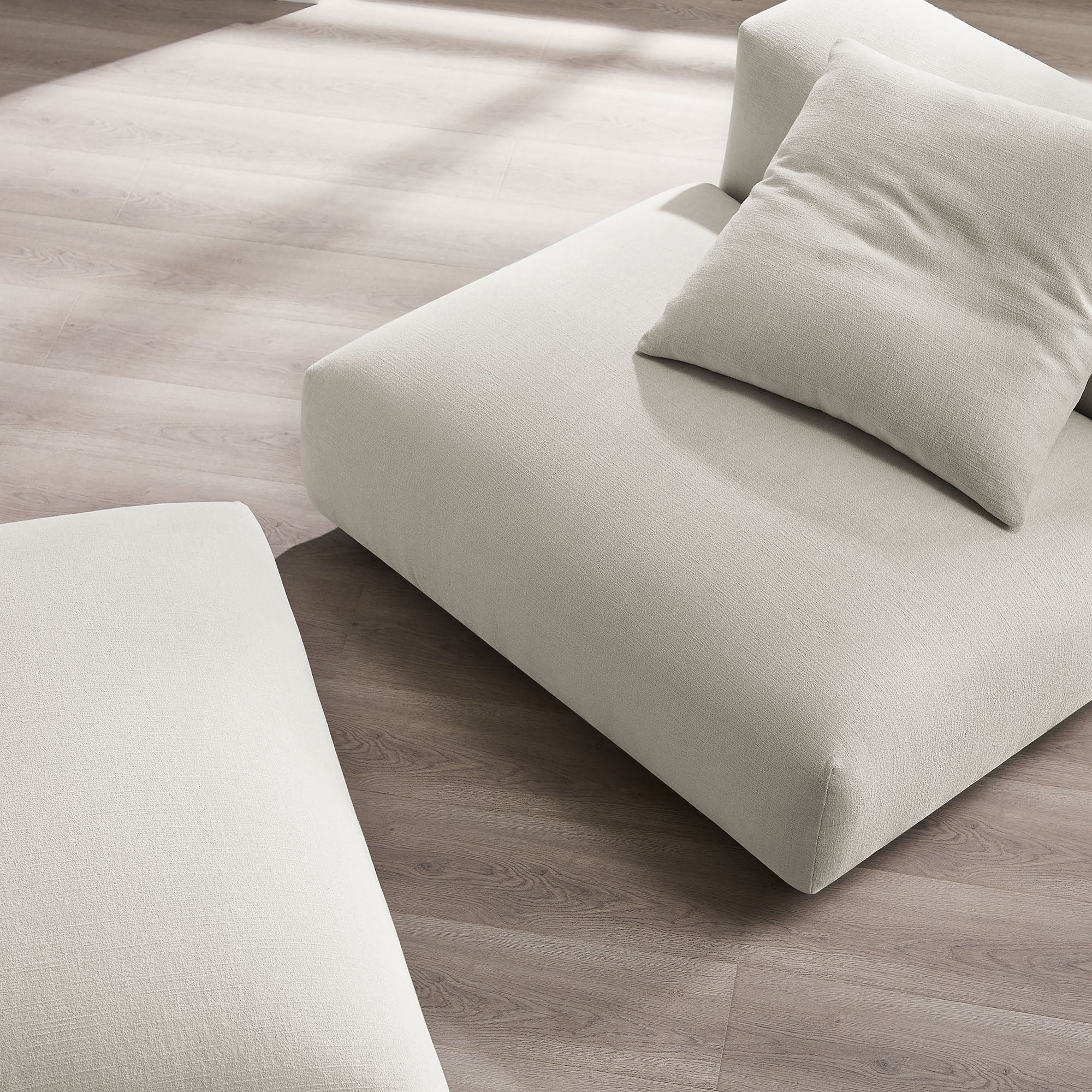 Revel in ultimate comfort and modern style with the Solace Modular Armless Chair and Ottoman Set. This oversized fabric armless chair with a matching ottoman is perfect for any living room, offering endless flexibility. Its modular furniture design allows you to change the arrangement to suit the needs of the moment or expand your seating by adding more pieces in the future. Featuring a sturdy frame, dense foam padding, and a sinuous spring support system, the Solace Armless Chair and Ottoman grants a premium seating experience with its soft textured woven fabric upholstery. The comfy upholstery adds a cozy, casual vibe, making this upholstered large chair with ottoman a perfect addition to any living space or lounge area. Equipped with non-marking plastic glides and a complementing accent pillow, this oversized accent chair and ottoman set is both stylish and practical. With no assembly required, you can enjoy immediate relaxation with this 2 piece armless chair with ottoman. Chair Weight Capacity: 800 lbs., Ottoman Weight Capacity: 500 lbs.