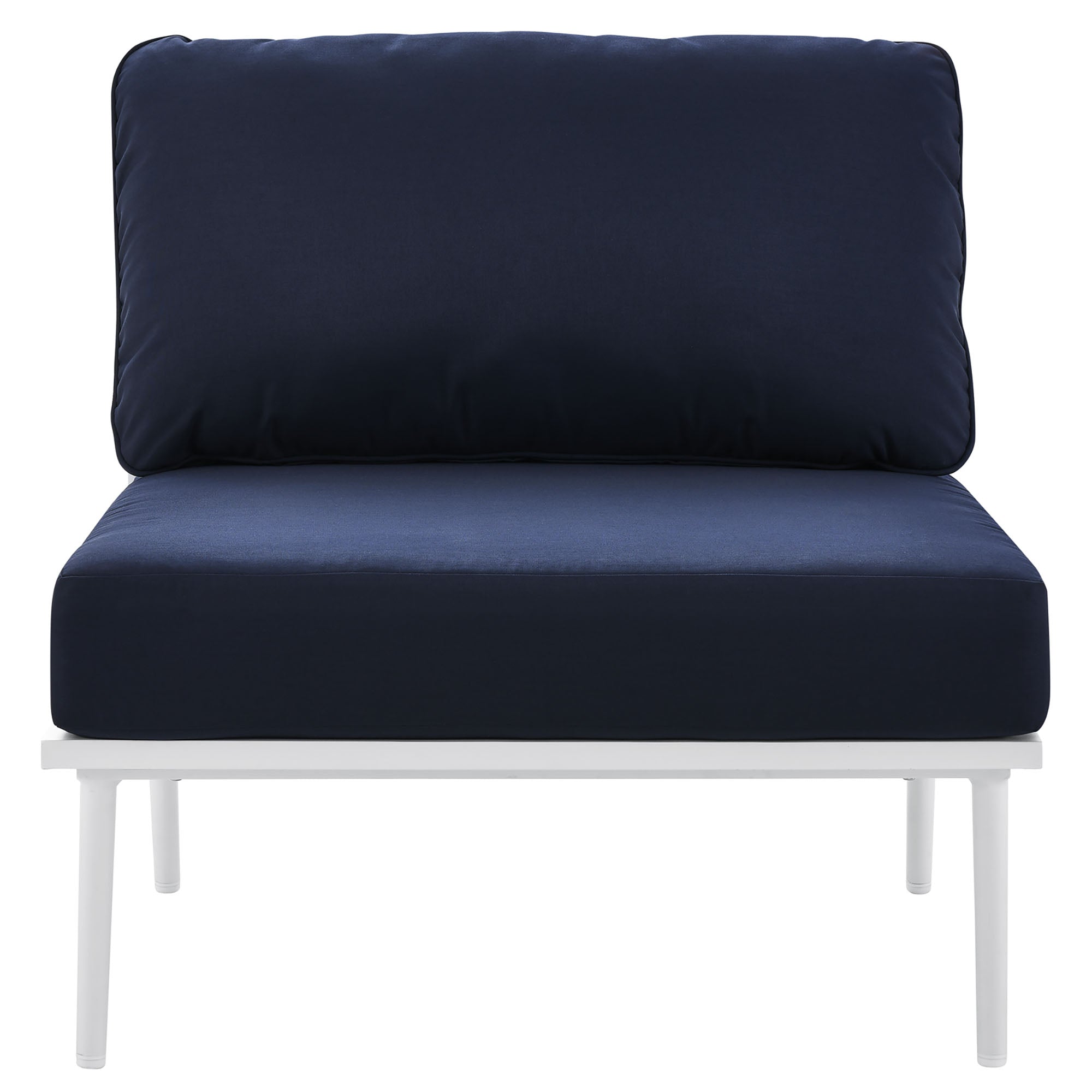 Gather family and friends for pleasant weather and good conversation with the Stance Outdoor Patio Armless Chair. Boasting a contemporary modern look, the Stance Armless Chair features a woven polyester fabric rope seat back and flared powder-coated aluminum frame, while water resistant all-weather fabric cushions with dense foam padding provide a relaxing spot to lounge. This is a versatile patio armless chair designed for long-lasting durability. Each piece in the Stance Outdoor Collection can be mixed and matched and effortlessly arranged to fit the spontaneous needs of you and your guests. Stance includes non-marking, height-adjustable foot caps. Assembly Required. Chair Weight Capacity: 331 lbs.